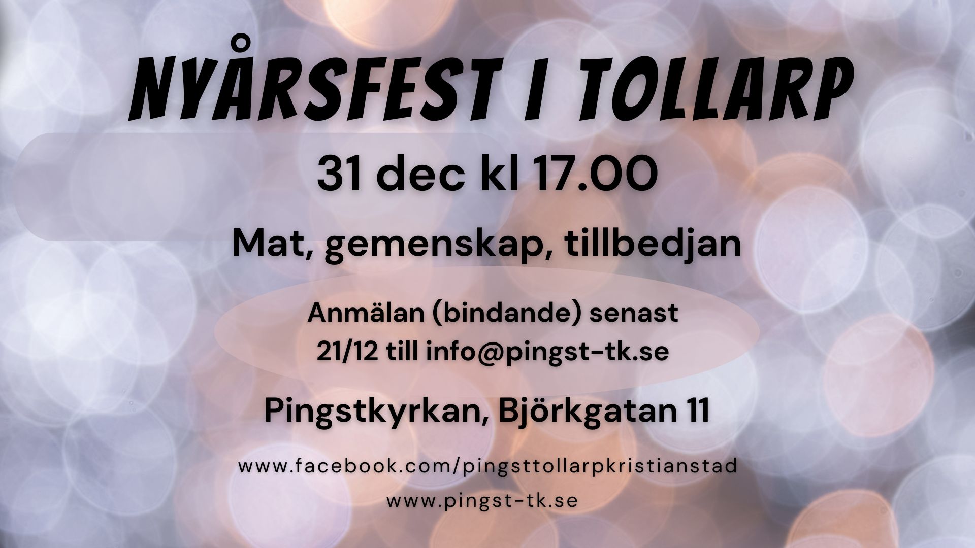 På nyårsafton 31 dec äger Pingstförsamlingens nyårsfest rum med start kl 17.00. Sista anmälningsdag är 21 december (bindande anmälan). Vi återkommer med information om vad det kommer att kosta.