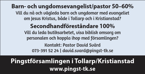 Vi söker en Barn- och ungdomsevangelist/pastor 50-60% Vill du nå och vägleda barn och ungdomar med evangeliet om Jesus Kristus, både i Tollarp och i Kristianstad? Vi ser ett behov av att stärka och utveckla barn- och ungdomsverksamheten både i Tollarp och i Kristianstad. Därför söker vi dig, som bär en evangelist- eller pastorskallelse och…